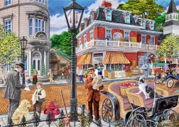 Vibrant artwork featuring period houses, carriages, and a bustling market turns puzzling into a visually appealing experience for kids and adults alike.