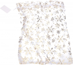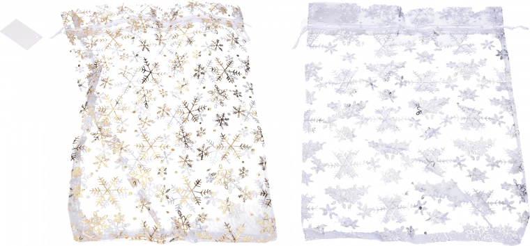 Elegant organza bag with Christmas snowflakes, ideal for gift wrapping. Available in gold and silver designs.