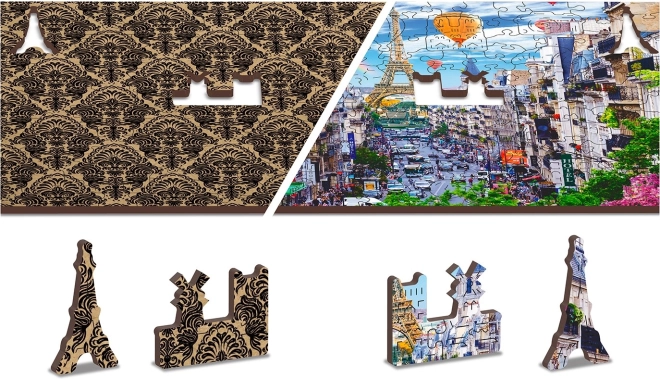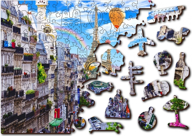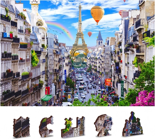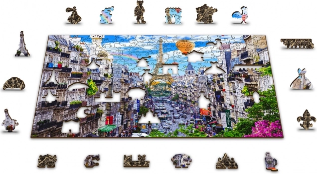 The Wooden Puzzle Busy Paris by WOODEN CITY is unique with its double-sided construction and specially shaped pieces, bringing the entire scene to life when assembling. Assembly is more challenging due to the differently shaped pieces but also more fun. It presents a challenge even for experienced puzzle enthusiasts.
