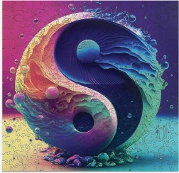The puzzle captivates with its modern and colorful Yin Yang motif, symbolizing balance and harmony. The transitions from turquoise to purple are a refreshing experience for the eyes.