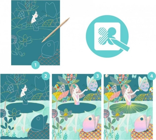 Discover the magic of creating with the scratch art pictures set by DJECO. After gently scraping off the top layer, a beautiful lake fairy and her friends are revealed. The set is ideal for creative relaxation and developing fine motor skills, delighting both children and adults.