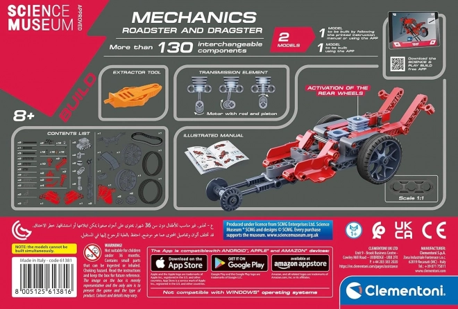 This CLEMENTONI SCIENCE & PLAY kit introduces children to mechanics and engineering. Build a nimble roadster or a powerful dragster and learn how gears, connecting rods, pistons and gear modules work. Thanks to the precise fit of the pieces, you will enjoy robust constructions and smooth movement.