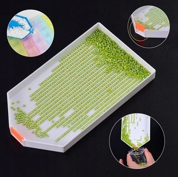 - Canvas with a pre-printed image and adhesive layer, applicator pen, tray, wax, set of colored drills, symbol legend