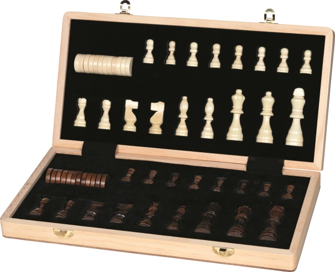 Discover classic fun in a quality wooden design. The 2-in-1 chess and checkers set features high-quality magnetic pieces that hold well on the squares, and a folding chessboard measuring 38 × 38 cm. Magnets ensure stable play at home or on the go.