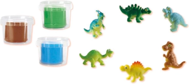 - 1× suitcase, 6× dinosaur figure, 3× tub of modeling dough (glitter colors)