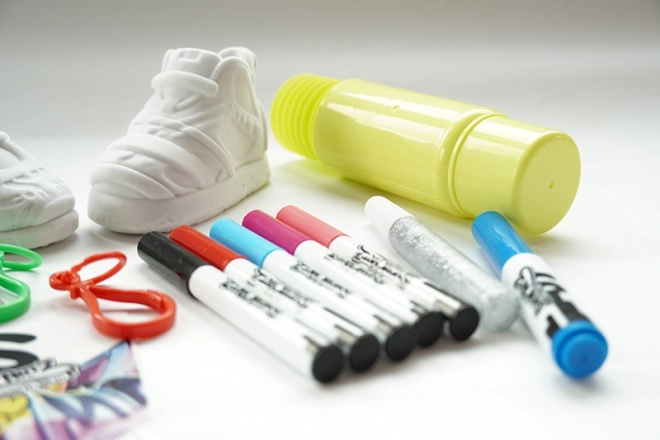 - Complete creative set: sneakers, markers, glitter, stickers, charms, and a collector’s list.