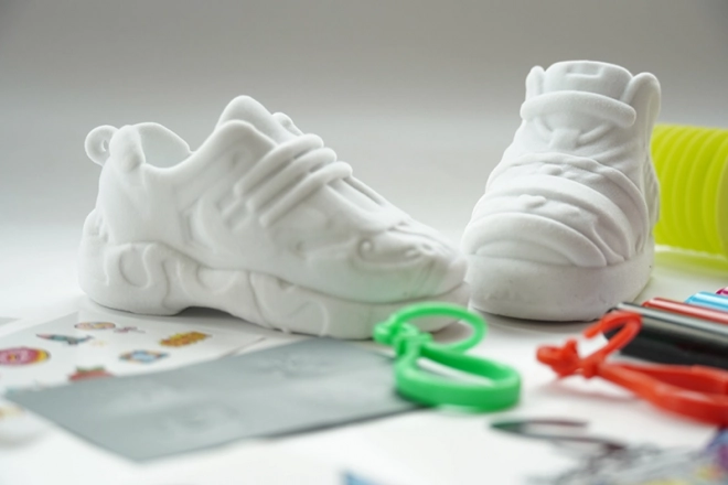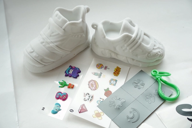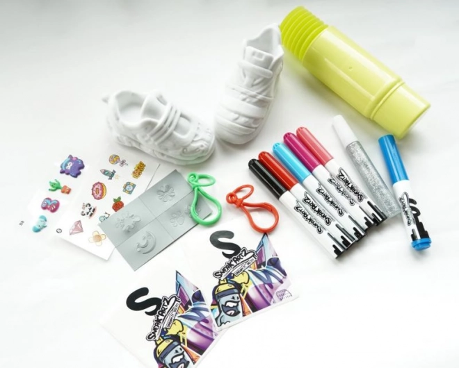 The set includes 2 sneakers ready to decorate – color, stick, add sparkle, and create your own style.