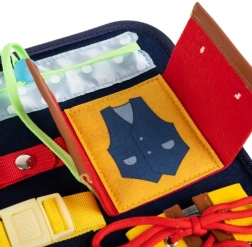 Includes 14 diverse elements such as zippers, buckles, buttons, and others that support practical skills and independence.