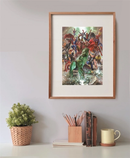 A colorful scene with superheroes stands out thanks to high-quality printing and sturdy cardboard.
