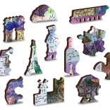 The puzzle includes pieces in the shapes of famous buildings, objects, or animals, appreciated by both kids and adults.