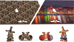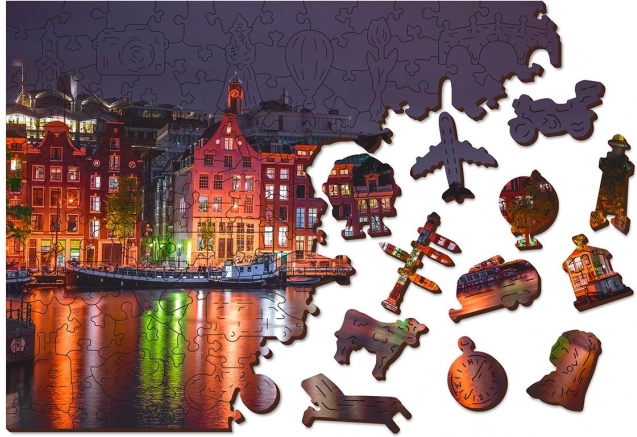 This unique wooden puzzle will delight every jigsaw enthusiast. Thanks to laser cutting, the puzzle features smooth edges that connect easily. It includes a total of 150 pieces, 30 of which have unique shapes like animals or famous buildings, adding an educational element as well as visual appeal. The puzzle is designed as a 2-in-1, meaning you can assemble it by the refined night motif of Amsterdam or by following the shape-based pattern on the reverse.
