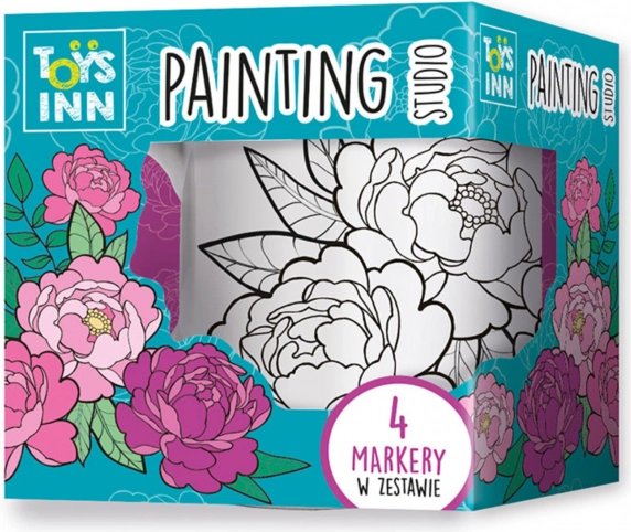 Discover creative fun with a ceramic coloring mug featuring a peony design. Children can personally decorate their mug using four colored markers: yellow, pink, green, and purple.
