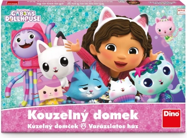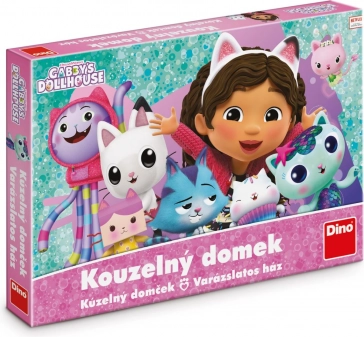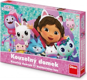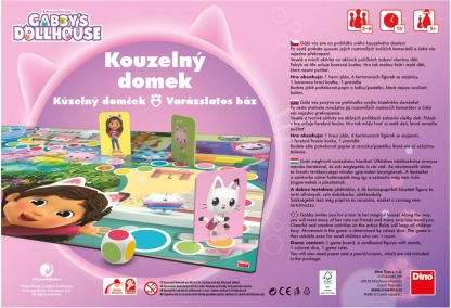 Children’s game Gabby and the Magical Dollhouse by Dino. Easy rules with a color die, fun from age 3, 15-minute playtime. Adorable figures and action spaces.