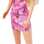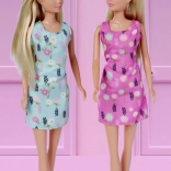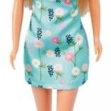 The doll is available in two color variations of dresses, pink and turquoise, each with beautiful floral patterns.