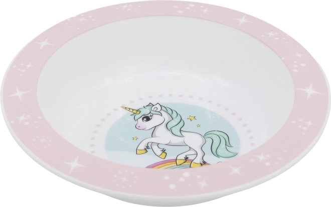 Children's bowl with a unicorn motif. Ergonomic design, microwave safe, and BPA-free. Cheerful look, a safe choice for everyday meals.