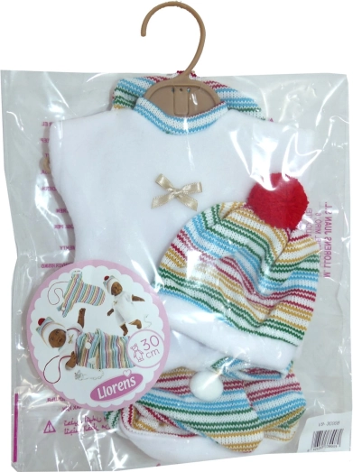 Stylish 3-piece outfit for a 30 cm Llorens baby doll delights with quality and detail. Includes a practical carry bag with hook-and-loop fastening, all handmade in Spain. An ideal accessory to develop imagination and doll care. Handmade in Spain, 3-piece set, hook-and-loop carry bag, for 30 cm dolls, ages 3+.