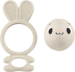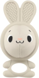 Silicone bunny with textured ears and an opening for a secure baby grip. A removable jingling ball encourages movement and develops fine motor skills.