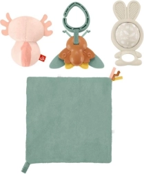 Discover sensory fun for newborns with the FISHER‑PRICE Senses World gift set. Inside you’ll find 4 adorable toys: a BPA‑free silicone bunny teether, a super‑soft axolotl with a bell, a tactile butterfly rattle with a clip, and a soft crinkle panel with a ribbon. The toys are easy for little hands to hold, supporting fine motor skills and the development of vision, hearing, and touch. The clip allows attachment to a stroller, bag, or play mat, so you can enjoy them on the go.