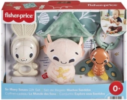 The FISHER‑PRICE Senses World gift set is a thoughtfully curated selection of first toys for babies, inviting exploration through contrasts, varied textures, and gentle sounds. Each piece is designed for safe grasping, soothing during teething, and supporting early sensory development.