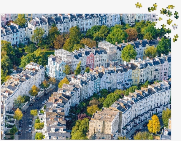 The atrial aerial view of Notting Hill delivers a striking composition of colors and details, delightful while assembling and stunning on the wall once finished.