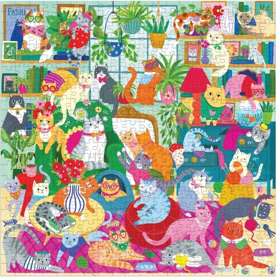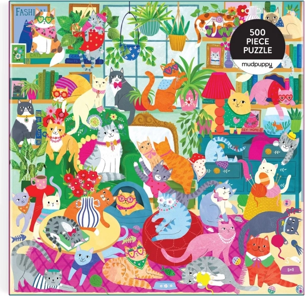 The puzzle offers a colorful illustration full of cats in various colors and patterns in a cozy domestic setting.