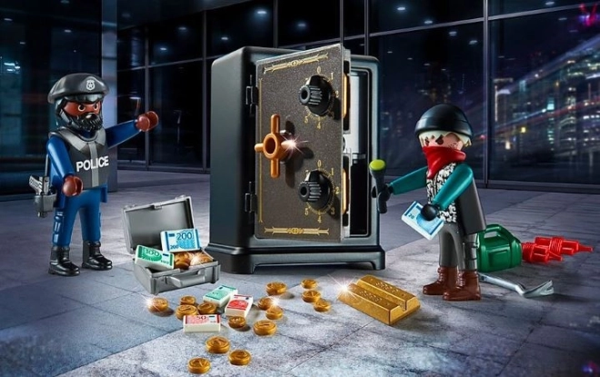 The fun PLAYMOBIL City Action starter set delivers thrilling action – a safe break-in. A thief is trying to open a well-secured safe, but a sharp-eyed police officer is hot on his heels. The set includes a working safe with rotating dials and lots of accessories for realistic play.