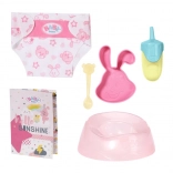 - Rich accessories: bottle, pacifier on ribbon, diaper, plate, spoon, potty, bowl/feeding set, brochure.