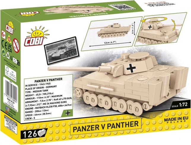 A mini model of the legendary Panzer V Panther tank by COBI in 1:72 scale made of 126 pieces will delight beginners and collectors alike. It offers a rotating turret, a movable barrel, and high-quality prints with historical markings. Made in the EU, fully compatible with other brands, with a clear picture-based manual.