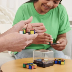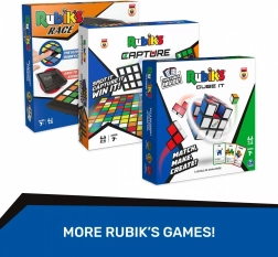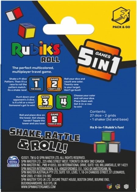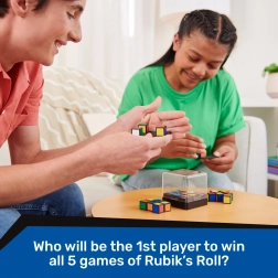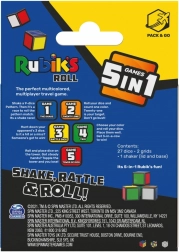 Rubik's Roll is a portable game containing 27 dice, a shaker, and two grids. This dynamic game includes five games: Shake, Twenty-One, Battle Dice, Trio, and Dice Tower, which combine different skills like counting and strategic dice placement.