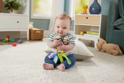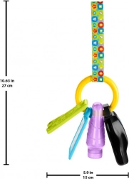 Each charm on the ring provides a different sensation: the musical key triggers vehicle sounds, songs, and phrases; the squeezable bottle supports tactile perception; the mirror encourages self-discovery; and the textured teether soothes during teething. Thanks to its lightweight construction, the toy is ideal for the stroller, car, and at-home play.