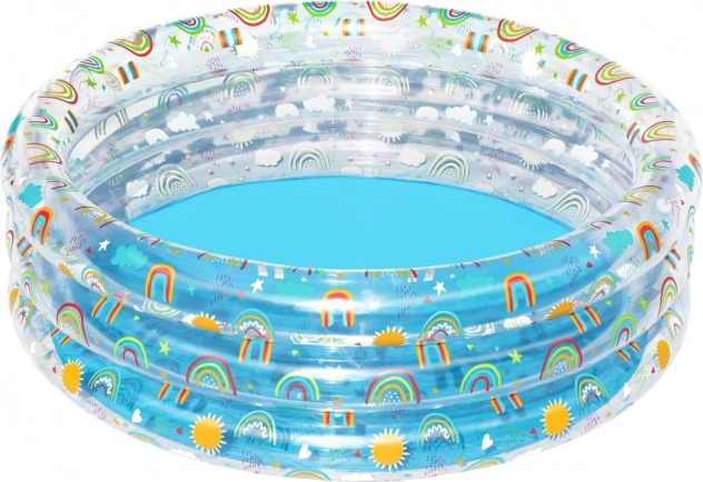 This children's inflatable pool with playful fruit graphics will turn your garden into a small bathing spot. The three-ring construction ensures greater stability and durability, while the soft inflatable bottom provides comfort when sitting and playing. Thanks to its compact dimensions, the pool is easy to place on a lawn or terrace, and maintenance is simple.