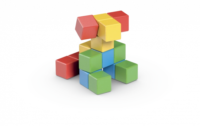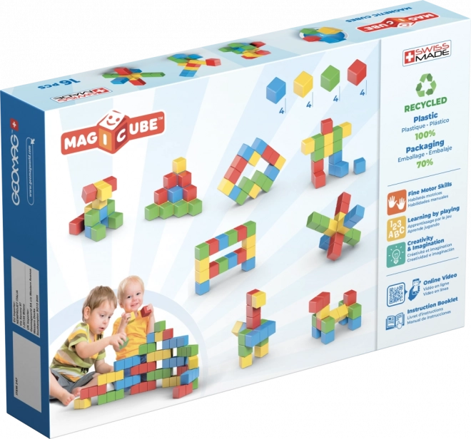 Thanks to a special internal design, the magnetic cubes attract on all six sides and even hold freely in space—building in 3D. Includes 16 cubes in four colors. Suitable from 1 year.