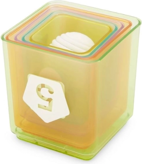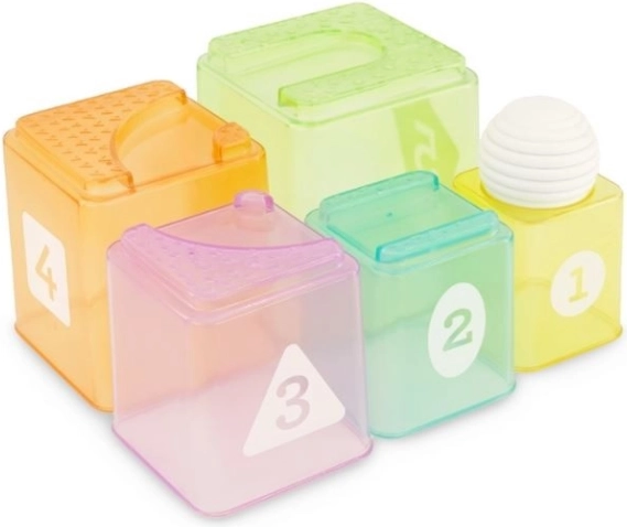 The Infantino stacking cups with ball set is ideal for first explorations of shapes, colors, and numbers. The transparent cups with clear numbers can be stacked from smallest to largest to build stable towers, which develops fine motor skills and spatial awareness.