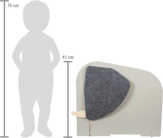 A cute and practical elephant toy box with an integrated seat and hidden 360° wheels for easy moving. Offers a large storage space with a safety lid to protect little fingers, front compartments for books and crafts, and a pull-out rod for a roll of paper. Made from sustainable materials with quality felt details and a load capacity of up to 50 kg – ideal for kids’ rooms and preschools.