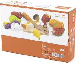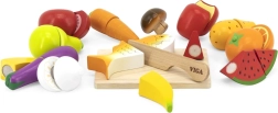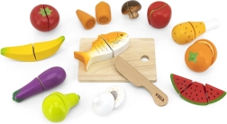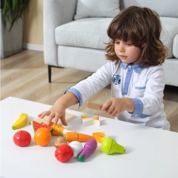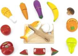 This quality wooden set includes a varied selection of fruit, vegetables, and other foods—from banana and watermelon to carrot, tomato, and fish. Children can safely try cutting with a wooden knife on the board and learn to recognize different types of food, colors, and shapes. Ideal for independent play or cooking together with parents.