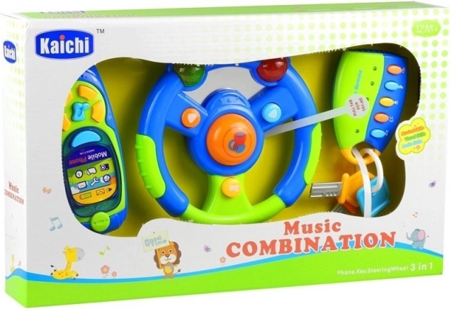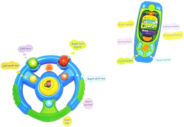 Our interactive set for kids includes a steering wheel, phone, and keys. Each part is crafted to easily fit into small children's hands, providing fun and educational play.