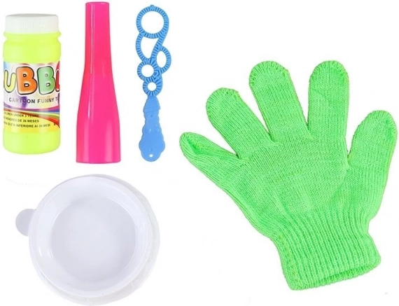 - Glove (universal size), solution bowl/base, bubble wand, pink funnel/tube, bottle of bubble solution