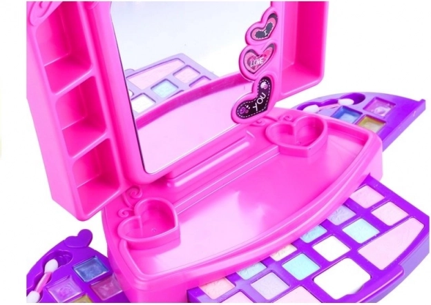 A magical pink‑purple vanity for little fashionistas brings hours of creative fun. It features a working mirror with three lights, practical compartments for accessories, a sliding drawer with colorful eyeshadows and blushes, and side sets of lip glosses. The safe build, smooth shapes, and compact size are ideal for children aged 3 and up.