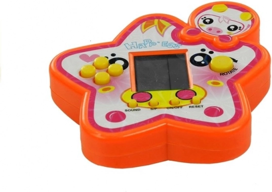 The electronic game in an orange case is very light and, thanks to its compact dimensions, ideal for carrying around. It features a display and yellow buttons for controlling game functions. The buttons let you start and stop the game, mute sounds, and reset the board for a fresh start. Additional buttons are used for in-game navigation and rotating blocks. This pocket version of the electronic game is an ideal companion for free moments, whether you’re on the bus, at home, or taking a break between tasks.