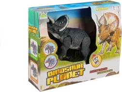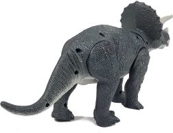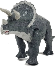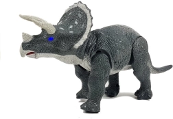 Meet the perfect replica of the large Triceratops dinosaur that lived 125–100 million years ago. This model is designed with a distinct skull and massive muscular build. Powered by three "AA" 1.5V batteries, once turned on, the dinosaur will walk, roar, and move its head, offering a realistic experience through light effects, such as eye blinking.