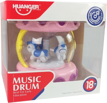 The drum features an inner carousel with little horses, providing an interactive visual experience for children.