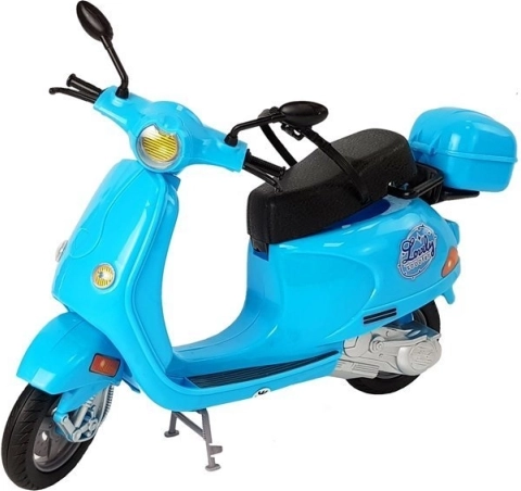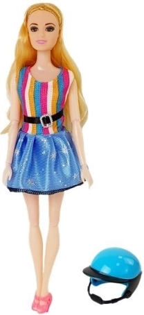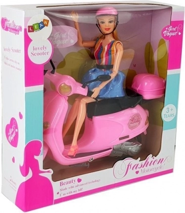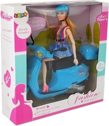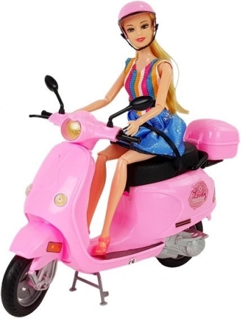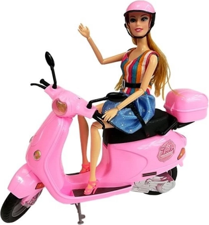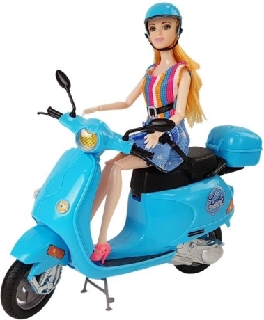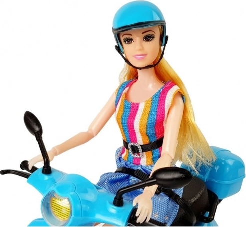 The doll in the set has long, blonde hair that can be brushed and styled. She is dressed in stylish dresses with blue and colorful stripes, complementing her elegant look. Movable arms and legs enable easy seating of the doll on the scooter, allowing children to create their own scenarios and stories.