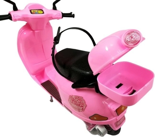 The pink scooter is intricately designed with realistic features such as mirrors and a storage box. With its stable construction and supports, it is stable during play.