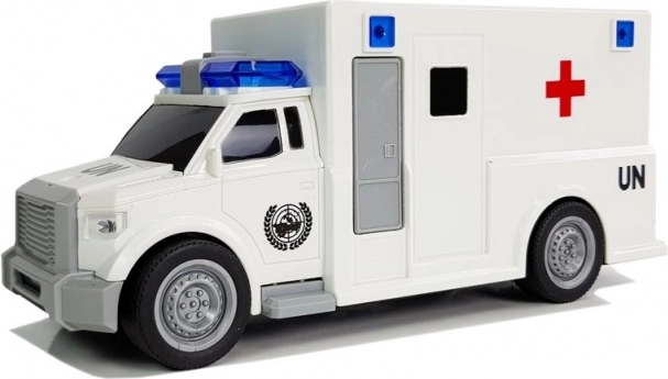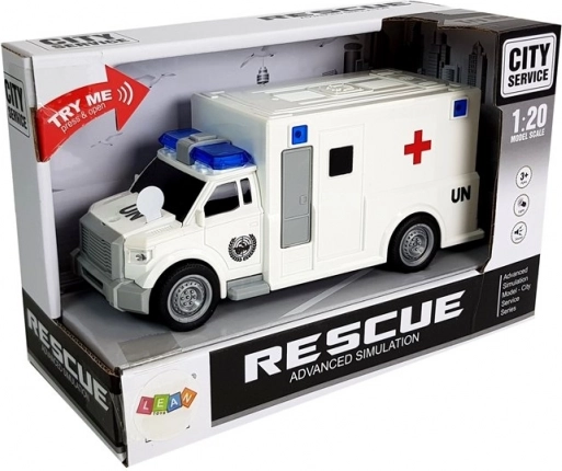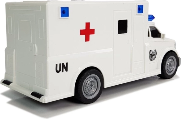The ambulance is made in 1:20 scale, has rubber wheels for quiet driving, and comes in a gift carton—ideal as a present for children aged 3+.