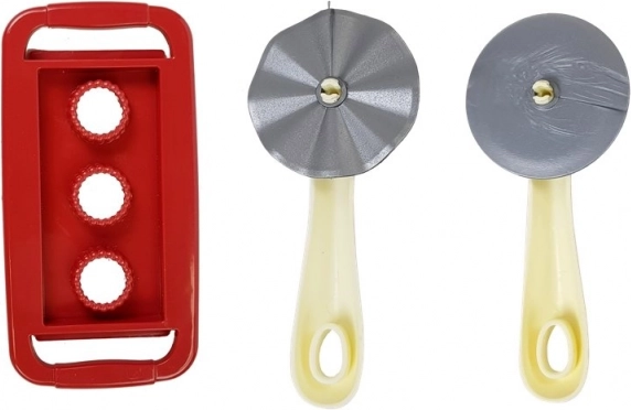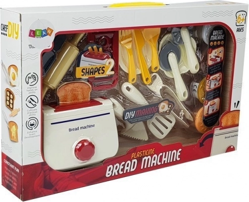 - Toaster, 2 interchangeable attachments (toast, elongated “macarons”), 4 tubs of modeling clay, plates, spoon, fork, spatula/turner, knife, rolling pin, bowl