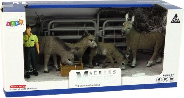 Includes 4× donkey, 1× farmer, and fencing. Practical packaging is ready as a gift for children aged 3+.