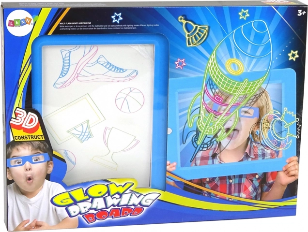 The magical backlit board is ideal for first steps in drawing and writing. The transparent panel with LED effects makes every stroke glow, and at the press of a button it conjures up different light modes. Simply insert a stencil, trace the outlines with fluorescent markers, and put on the 3D glasses—the pictures instantly turn into an impressive 3D show.