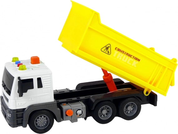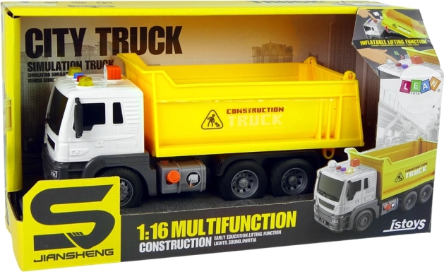 This yellow construction dump truck faithfully imitates a real vehicle, so kids can step into the role of a job-site operator. Thanks to the lifting bed they can easily move “materials,” and with lights and sounds they’ll enjoy a more authentic play experience. The friction-powered drive just needs a push and the truck sets off on its own.