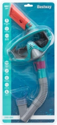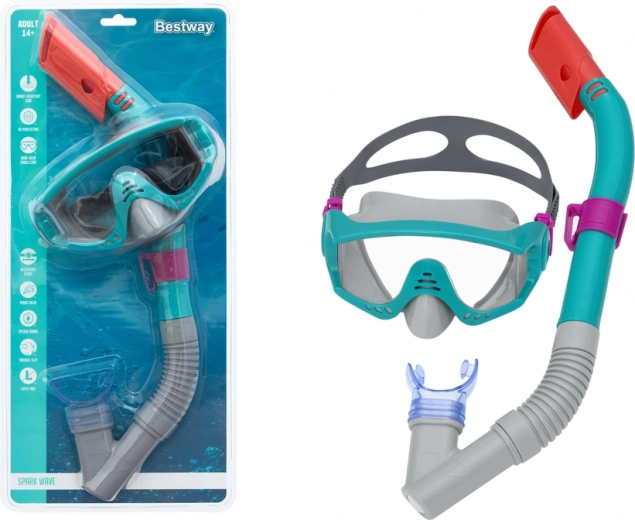 The BESTWAY snorkeling set for youth and adults aged 14+ combines a comfortable mask and snorkel for safe underwater exploration. Soft silicone sealing and an adjustable strap ensure a perfect leak-free fit, a durable lens with UV filter protects the eyes, and the snorkel with a soft mouthpiece and splash protection makes breathing easy. This lightweight, colorfully attractive set is ideal for vacations and pool use.