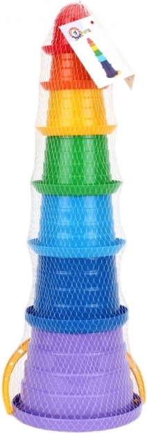The rainbow-colored pyramid is a toy that is great for toddler development. It consists of cups in various colors. The smallest cup is at the top of the toy. They are made of safe, non-toxic material known for its sturdiness and durability. The pyramid has a very simplified, rounded shape that contributes to the level of safety when using this item.